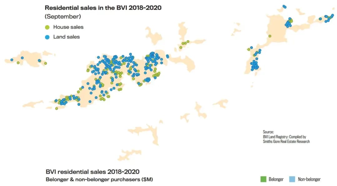 Considering the disruptions to the real estate market experienced in 2017 with Hurricane Irma and again in 2020 with the pandemic, the BVI real estate market has so far shown itself to be remarkably resilient. After the 2008 recession, the BVI property market struggled to gain momentum for a number of years with limited external investment resulting in typically twenty villa sales a year over $500,000 in value. Most of the villa sales were under $1.0M and few villas sold in excess of $3.0M. As the number of external investors reduced, the market started to see a higher percentage of Belongers acquiring villas as vendors became more willing to negotiate at lower prices. All that changed at the end of 2017 when Hurricane Irma destroyed or severely damaged much of the housing stock in the BVI. Far from reducing property sales, the damage caused by Irma created opportunities for mainly locally based investors, who were able to acquire damaged property from vendors motivated to exit. This led to an increase in the number of home sales, albeit at generally lower values reflecting the damaged nature of the properties being sold.At the same time, the market for land continued to grow as local investors bought into newly created sub-divisions mainly situated on Tortola. While there were positive signs that overseas investment in the BVI property market was picking up towards the end of 2019 and the early part of 2020, the closure of the BVI borders in March to tourists, prevented overseas purchasers from visiting the British Virgin Islands to view the property. Despite that, the isolated nature of the Caribbean Islands has appealed to the sense of security that many investors are seeking, and international inquiries for property in the BVI have remained strong. C BVI real estate market overview Reviewing the property market between 2018 and 2020 (to September), the patterns of investment that emerge, demonstrate both the activity within the local (Belonger) market and the importance of overseas investment to the real estate market as a whole and including the significant stamp duty that it generates for the Government.