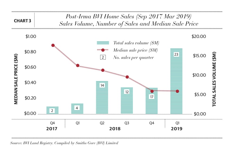 Chart 2 shows that the property market has remained active post Irma, even in the last quarter of 2017 when much of the commercial activity in the BVI had ground to a halt. The table shows the total sales volume for all types of property (land, houses and other property) by quarter between September 2016 and the first quarter of 2019. Total $0.20sales volume (expressed in US Dollars) in 2018 and 2019 has been boosted by land and property sales at Oil Nut Bay (3 sales in 2018 & $0.00Q1 2019) and Moskito Island (2 sales in 2018). Both developments were pro-active with their respective post Irma clean up and repairs to ensure they were functional in the shortest time possible. As a result, Oil Nut Bay was open to home owners by Christmas 2017 and the general public by Easter 2018. At Mosquito Island, all home owners who had commenced construction prior to Irma confirmed they were proceeding with their respective projects.
