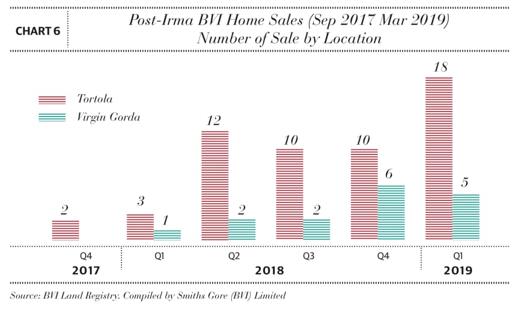 Finally, Chart 6 breaks down the sales post Irma between the Virgin Gorda and Tortola markets. As can be expected, the sales are dominated by the Tortola market where there is a larger inventory of houses and pool of investors.