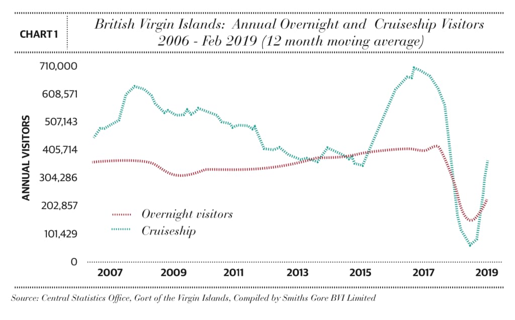 In contrast, the BVI’s tourism industry was devastated by Hurricane Irma with the sector still in recovery. Prior to Hurricane Irma, overnight visitors in the BVI reached a record high of 407,764 in 2016. In the immediate aftermath of the storm, airlift was restricted to emergency and evacuation services and, with much of the accommodation damaged or destroyed, very few tourists arrived in the BVI for several months. The annual average count of overnight visitors declined from 413,704 in August 2017 to 142,691 in August 2018, before increasing again, reaching 222,722 by February 2019 as shown on Chart 1.