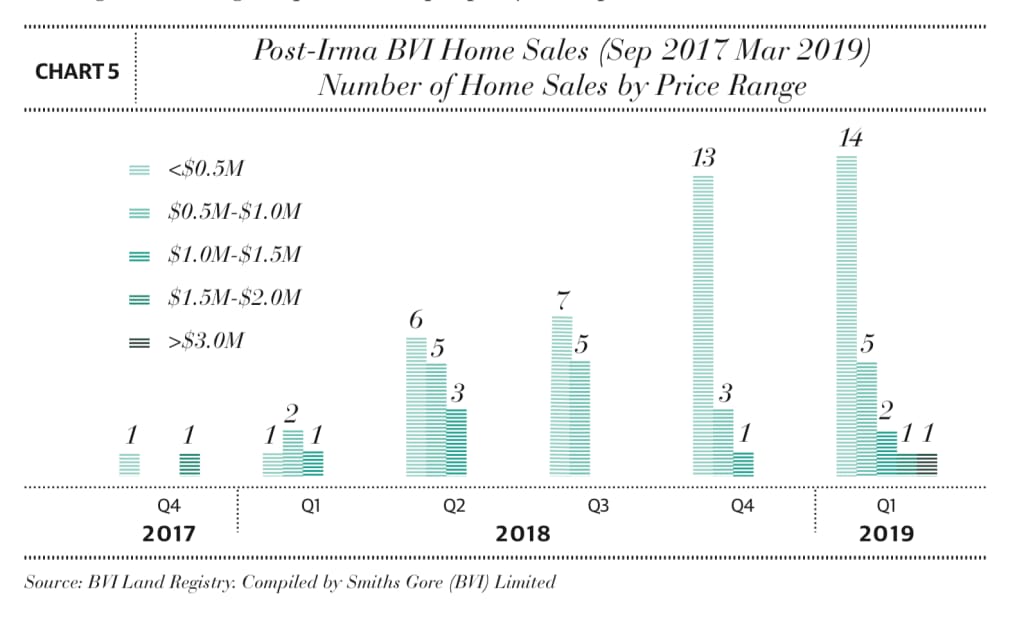 The price distribution of home sales post Irma by price range is shown in Chart 5 where the dominance of sales under $500,000 is clearly reflected and represents 60 of the total number of sales. In contrast, there have only been ten sales over $1.0M representing 14 of the total number of sales. The first quarter of 2019 had four sales over $1.0M (with one of the sales in excess of $3.0M). Overall, this quarter indicated a total of 22 property sales closing, the strongest quarter for property sales post Irma.